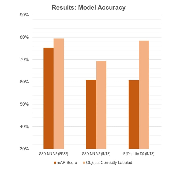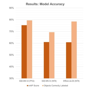 SSD-MobileNet-v2-FPNLite: It’s not quite as fast as regular SSD-MobileNet-v2, but it has excellent accuracy, especially considering the small size of the training dataset. It’s able to successfully detect 306 out of the 335 total objects in the test images. While the total number of objects detected is only slightly higher than EfficientDet-Lite-D0, it generally had 90% - 99% confidence in its predictions, while the EfficientDet model confidences ranged widely between 50% - 95%.