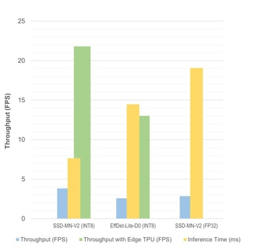 SSD-MobileNet-v2: With an inference time of 68.96 ms and a COCO mAP score of 60.99%, the quantized version of this model strikes a good balance between speed and accuracy. The floating point version can be used for a decent boost in accuracy with only a slight reduction in speed.