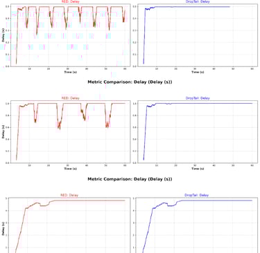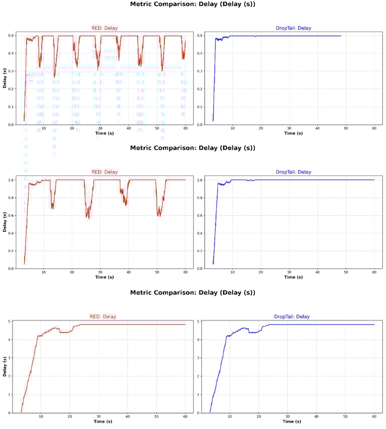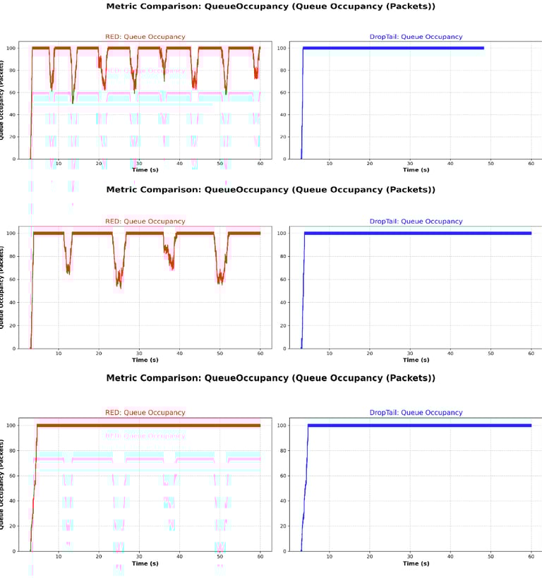 The analysis focused on comparing queue dynamics and performance trade-offs between DropTail and RED under varying backhaul bandwidth constraints. While both mechanisms maintained comparable throughput levels, their internal congestion behavior differed significantly. DropTail exhibited rapid queue saturation and prolonged buffer occupancy once the bottleneck link was reached, resulting in sustained high delay and increased latency variance. In contrast, RED introduced early probabilistic packet drops, preventing persistent queue buildup and producing cyclical queue behavior that stabilized average delay. Time-series queue tracing revealed that RED reduced long-term congestion accumulation, particularly under higher traffic loads. These findings highlight how early congestion signaling mechanisms can improve latency performance in high-throughput 5G environments, even when aggregate throughput remains similar.
