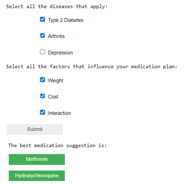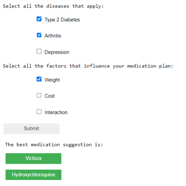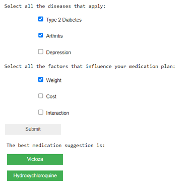 A Machine learning tool that predicts the combination of medication for patients with Discordant chronic comorbidities. The tool allows the user to select the combination of diseases and the factors that influence the medication treatment plans.
